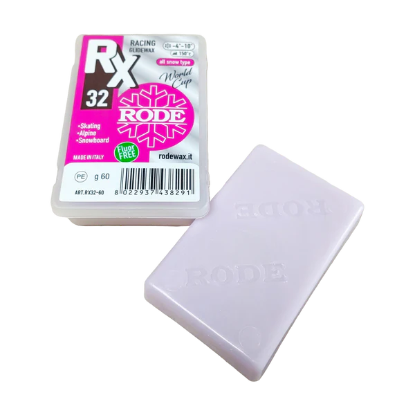 Rode`s new World Cup level melt wax! This paraffin line is was teased a few years back but Rode was not happy with the results. It was sent back to the lab, rigorously reworked, perfected, and now finally released! The RX32 is a cold to mild violet paraffin. Used for any mild snow condition, old or new snow between -4C and -10C. Use by itself or as a base layer for other liquid or block top coats.